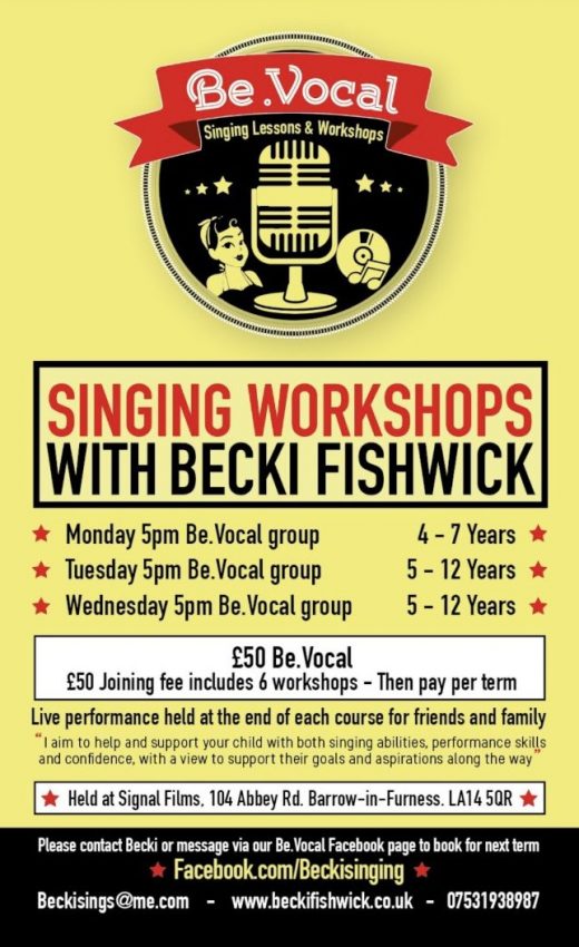 Set up by professional singer Becki Fishwick in 2016, based at her studio in Barrow-in-Furness, Be.Vocal welcomes children and adults to come and learn to sing, feel more confident and take part in local shows. All experiences welcome.